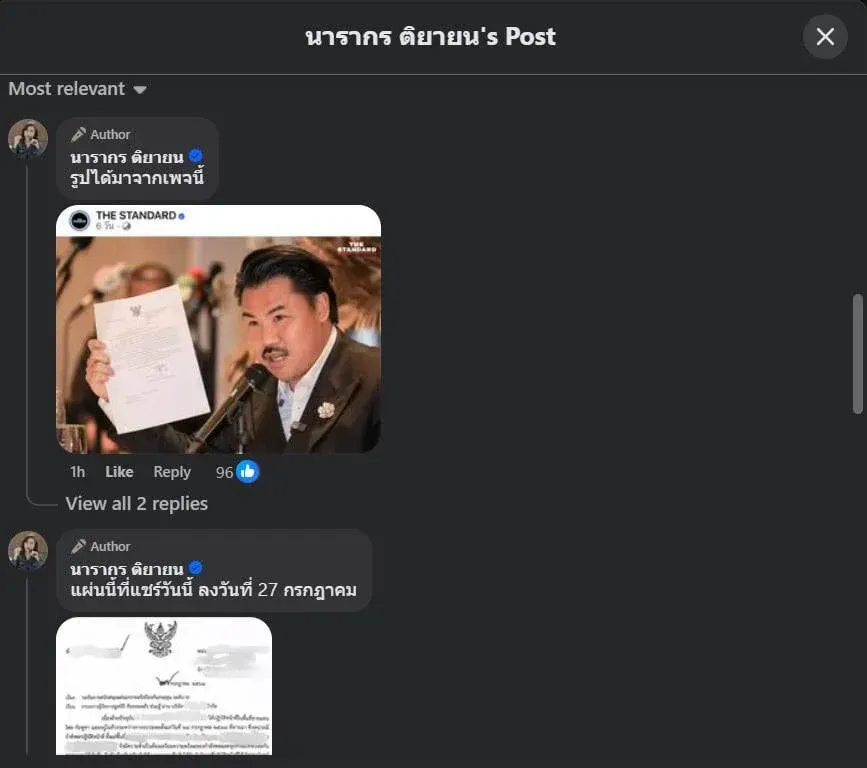 หลังจาก “ต๊ะ นารากร” นำเอกสารดังกล่าวออกมาเผยแพร่ในโลกออนไลน์ ภายในเวลาไม่กี่ชั่วโมง โพสต์ของเธอถูกแชร์ออกไปอย่างกว้างขวาง มีทั้งสื่อกระแสหลักและเพจข่าวออนไลน์หลายแห่งหยิบไปนำเสนอ