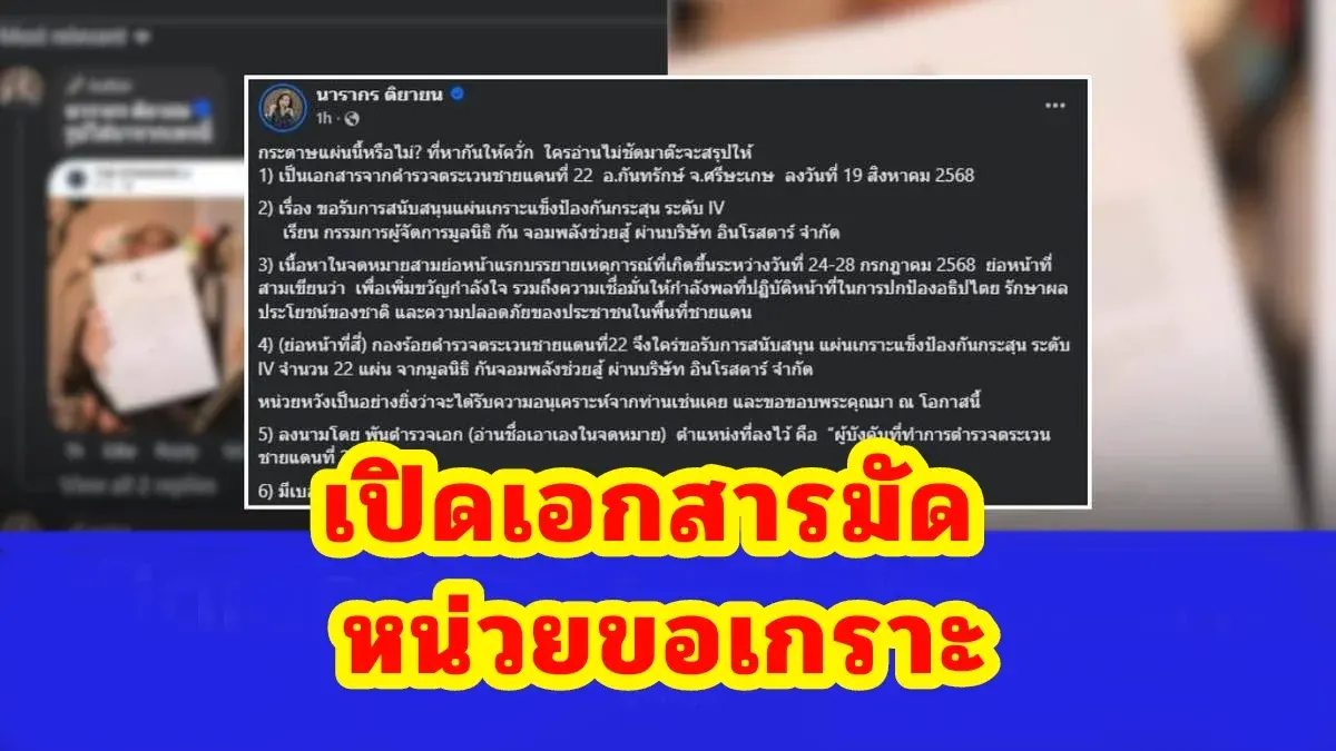 “ต๊ะ นารากร” เปิดเอกสารชิ้นสำคัญ! เผยต้นทางแท้จริงของหนังสือขอรับแผ่นเกราะ 22 แผ่น จาก กองร้อย ตชด.22 จังหวัดศรีสะเกษ ผ่านมูลนิธิ กัน จอมพลัง – ปมดราม่าระอุเริ่มคลี่คลาย