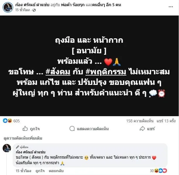 ต่อมาในวันที่ 30 ตุลาคม 2568 ก้อง ศรัณย์ ตำแซ่บ ได้เคลื่อนไหวอีกครั้งผ่านหน้าเพจเฟซบุ๊กของเขา โดยโพสต์ข้อความขอโทษสังคมอย่างเป็นทางการ พร้อมกับแนบรูปถุงมือและหน้ากากอนามัยเพื่อแสดงถึงความตั้งใจในการปรับปรุงพฤติกรรม เขาได้ระบุข้อความว่า “ถุงมือ และ หน้ากาก [อนามัย] พร้อมแล้ว… ขอโทษ… #สังคม กับ #พฤติกรรมไม่เหมาะสม พร้อมแก้ไขและปรับปรุง ขอบคุณแฟน ๆ ผู้ใหญ่ทุก ๆ ท่าน สำหรับคำแนะนำดี ๆ ขอโทษสังคมกับพฤติกรรมที่ไม่เหมาะทั้งเจตนาและไม่เจนตา ทุก ๆ ประการ น้อมรับผิดทุก ๆ การกระทำ”