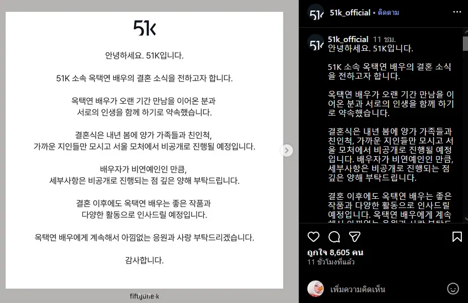 ก่อนหน้านี้ "แทคยอน" ได้เปิดเผยความสัมพันธ์ของเขากับแฟน ต่อสาธารณะในปี 2020" และ "ต้นปีนี้ 51K ก็ได้ออกมาลบล้างข่าวลือที่ว่า "เขาขอแฟนแต่งงานแล้ว หลังจากมีภาพไวรัลในปารีส..."