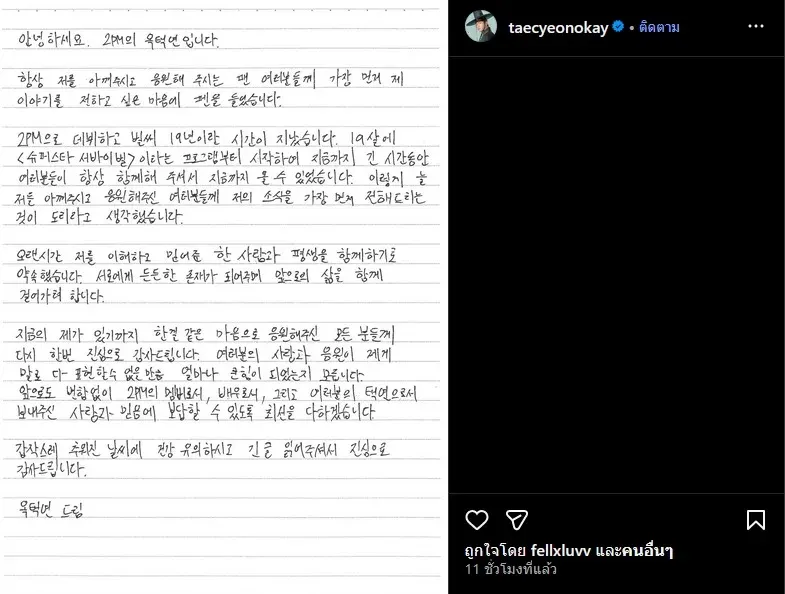 "แทคยอน" โพสต์ใน IG ส่วนตัวว่า "เพื่อขอบคุณแฟนๆ ที่อยู่เคียงข้างผม มาตลอดตั้งแต่ 2PM เดบิวต์ในปี 2008 ซึ่งผมรู้สึกว่า ผมควรอธิบายข่าวใหญ่นี้ให้กับทุกคนได้ฟัง" และ "ผมสัญญาว่าจะใช้ชีวิตที่เหลืออยู่ กับคนๆ เดียวที่เข้าใจและไว้วางใจผมมายาวนาน" และ "เราวางแผนที่จะเดินบนเส้นทางชีวิตไปด้วยกัน พร้อมกับเป็นเสาหลักที่คอยสนับสนุนกันและกันในอนาคต" และ "ผมขอขอบคุณทุกคนอีกครั้ง สำหรับการสนับสนุนที่ทำให้ผม กลายเป็นคนที่ผมเป็นในวันนี้ คุณไม่รู้หรอกว่าความรักและการสนับสนุนของคุณ มอบความแข็งแกร่งให้กับผมมากขนาดไหน ถึงขนาดที่ผมไม่สามารถอธิบายออกมา เป็นคำพูดได้ทั้งหมด!!" และ "ผมขอให้คำมั่นว่า ผมจะตอบแทนความรักและความไว้วางใจของพวกคุณต่อไป ในฐานะนักแสดงกับวง 2PM และ ในฐานะ "แทคยอน" และ "ผมขออวยพรให้ทุกคนมีสุขภาพแข็งแรง"