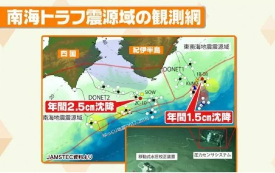 มาชิดะ รองผู้อำนวยการ JAMSTEC อธิบายว่า พวกเขาได้จัดตั้งระบบสังเกตการณ์และติดตามแผ่นดินไหวและสึนามิที่เรียกว่า "DONET" ระหว่างคาบสมุทรคิอิและช่องแคบชิกาอิชิ ระบบนี้ให้การเฝ้าระวังแผ่นดินไหวและสึนามิแบบเรียลไทม์บนพื้นทะเลเหนือแหล่งกำเนิดแผ่นดินไหวโดยตรง ด้วยการใช้เทคโนโลยีล่าสุด ทีมวิจัยได้แก้ไขข้อผิดพลาดในการวัดแรงดันน้ำทะเลลึก และยืนยันว่าพื้นทะเลกำลังจมลงในอัตราประมาณ 1.5 ถึง 2.5 เซนติเมตรต่อปี อัตรานี้อยู่ที่ 1.5 เซนติเมตรนอกชายฝั่งตะวันออกเฉียงใต้ของคาบสมุทรคิอิ และมากถึง 2.5 เซนติเมตรนอกชายฝั่งตะวันตกเฉียงใต้
