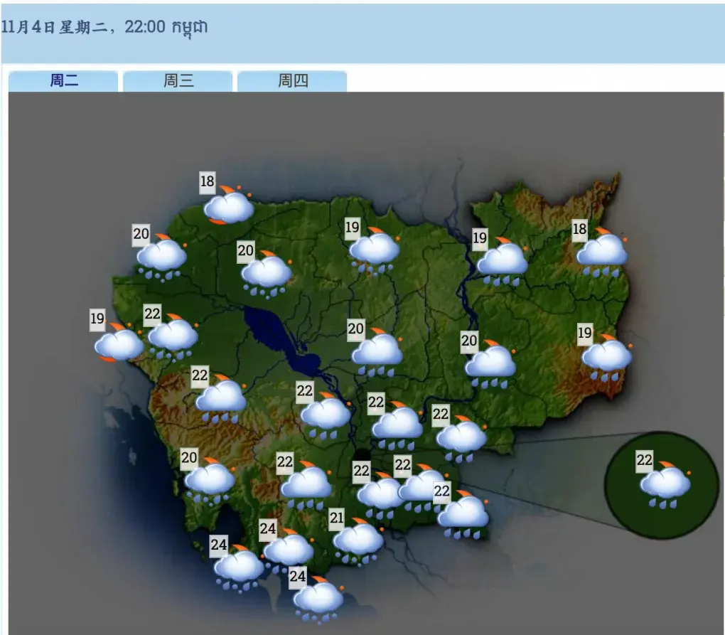 ในพื้นที่ราบอย่าง พนมเปญ เสียมเรียบ พระตะบอง และ สวายเรียง จะมีอุณหภูมิต่ำสุดประมาณ 21°C และสูงสุดราว 30°C พร้อมมีแนวโน้มเกิดพายุฝนฟ้าคะนองในช่วงเย็นวันนี้ [ตามเวลาท้องถิ่น] ส่วนพื้นที่สูง เช่น พระวิหาร มณฑลคีรี ไพลิน และ สตึงแตรง อุณหภูมิต่ำสุดอยู่ที่ 18°C สูงสุด 28°C ซึ่งคาดว่าจะมีลมกระโชกแรงและฝนตกหนักเป็นระยะ