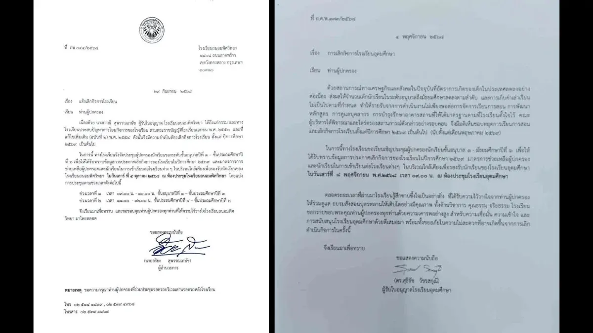 ทางโรงเรียนได้ขอเรียนเชิญประชุมผู้ปกครองนักเรียนชั้นอนุบาล 1 ถึงมัธยมศึกษาปีที่ 6 เพื่อให้รับทราบข้อมูลการประกาศเลิกกิจการ โดยเฉพาะ มาตรการช่วยเหลือผู้ปกครอง ในการเข้าเรียนต่อโรงเรียนต่าง ๆ ในบริเวณใกล้เคียงเพื่อรองรับนักเรียนของโรงเรียน