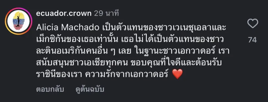 Alicia Machado เป็นตัวแทนของชาวเวเนซุเอลาและเม็กซิกันของเธอเท่านั้น เธอไม่ได้เป็นตัวแทนของชาวละตินอเมริกันคนอื่นๆ เลย ในฐานะชาวเอกวาดอร์ เราสนับสนุนชาวเอเชียทุกคน ขอบคุณที่ใจดีและต้อนรับราชินีของเรา ความรักจากเอกวาดอร์