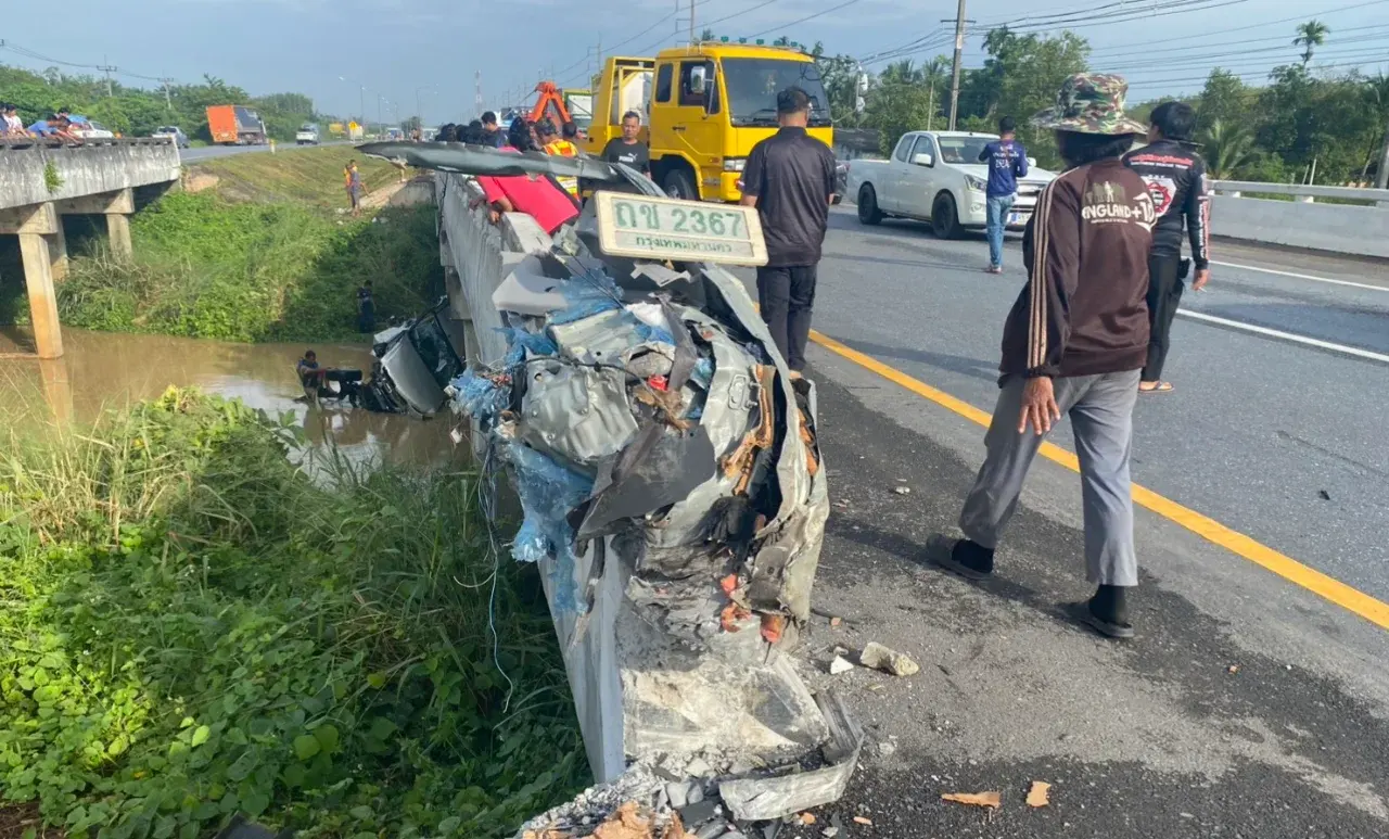 กู้ระทึก!กระบะซิ่งเหินฟ้าชนราวสะพานกระเด็นตกคลองจมดิ่ง กู้ภัยเร่งกู้ ส่วนคนขับยังไม่ทราบชะตากรรม