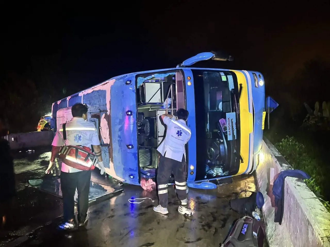 รถบัสท่องเที่ยวพลิกคว่ำที่จังหวัดลำปาง ทำให้ผู้โดยสารได้รับบาดเจ็บมากกว่า 39 ราย