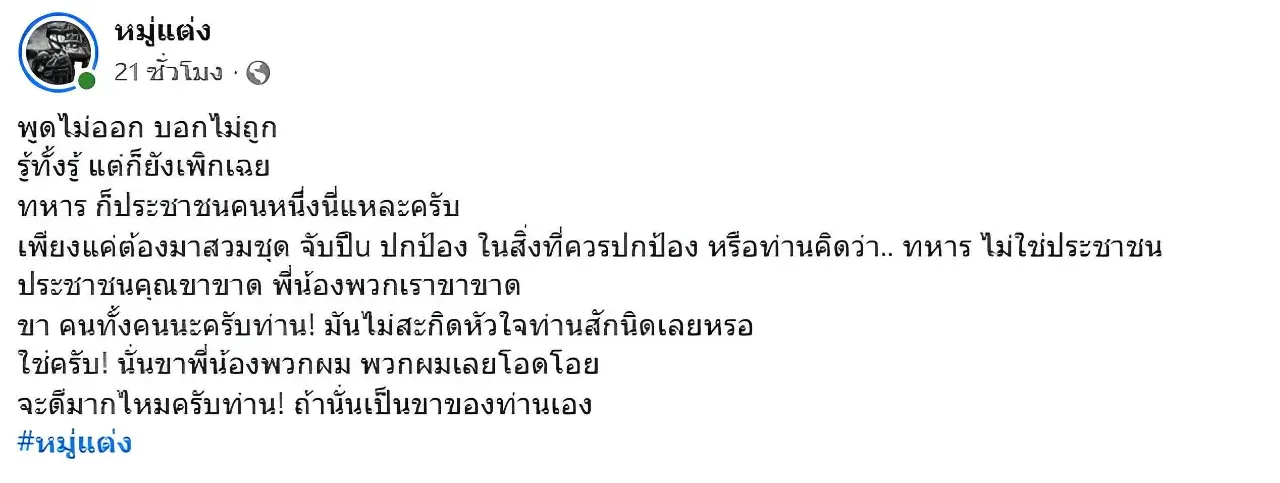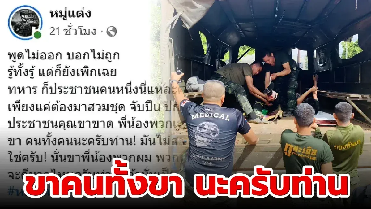 นี่คือเสียงสะเทือนใจจากแนวหน้า… เสียงของทหารตัวเล็กๆ ที่วันนี้ไม่อาจเงียบได้อีกต่อไป หลังเกิดเหตุสะเทือนใจที่ จ่าสิบเอก เทิดศักดิ์ สมาพงษ์ ต้องเสียขา ขณะปฏิบัติหน้าที่พิทักษ์ชายแดนไทย เหตุการณ์ครั้งนี้ทำให้ “หมู่แต่ง” ทหารระดับผู้น้อยที่เห็นทุกอย่างกับตาและเจ็บปวดกับมันทุกวัน ออกมาโพสต์ระบายความรู้สึกอย่างตรงไปตรงมา จนคนอ่านต้องหยุดคิดตาม