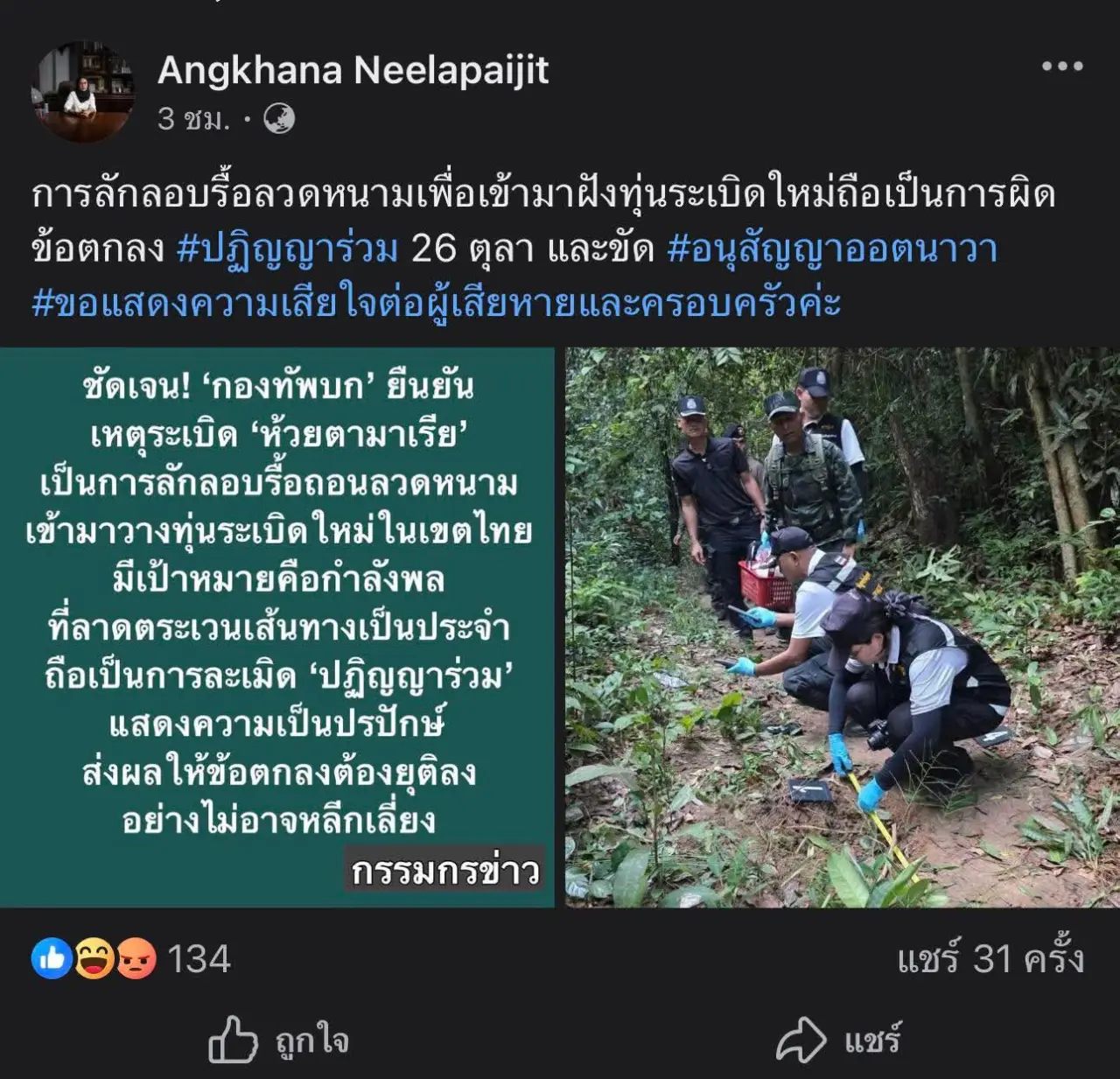วันที่ 11 พฤศจิกายน ส.ว. อังคณา นีละไพจิตร โพสต์ข้อความผ่านเฟซบุ๊ก แสดงความกังวลและเสียใจอย่างสุดซึ้งต่อเหตุการณ์ที่ทหารไทยนายหนึ่งเหยียบกับระเบิดบริเวณ “ห้วยตามาเรีย” พื้นที่แนวชายแดนไทย–กัมพูชา ซึ่งทำให้ต้องสูญเสียขา กลายเป็นผู้บาดเจ็บสาหัสรายที่ 7 จากเหตุลักษณะเดียวกันในช่วงไม่กี่เดือนที่ผ่านมา