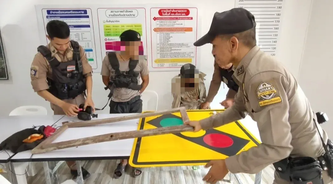 หัวจะปวด! ตำรวจจับ 2 หนุ่มใหญ่คาป้ายบอกทาง อ้างเก็บได้ข้างทาง