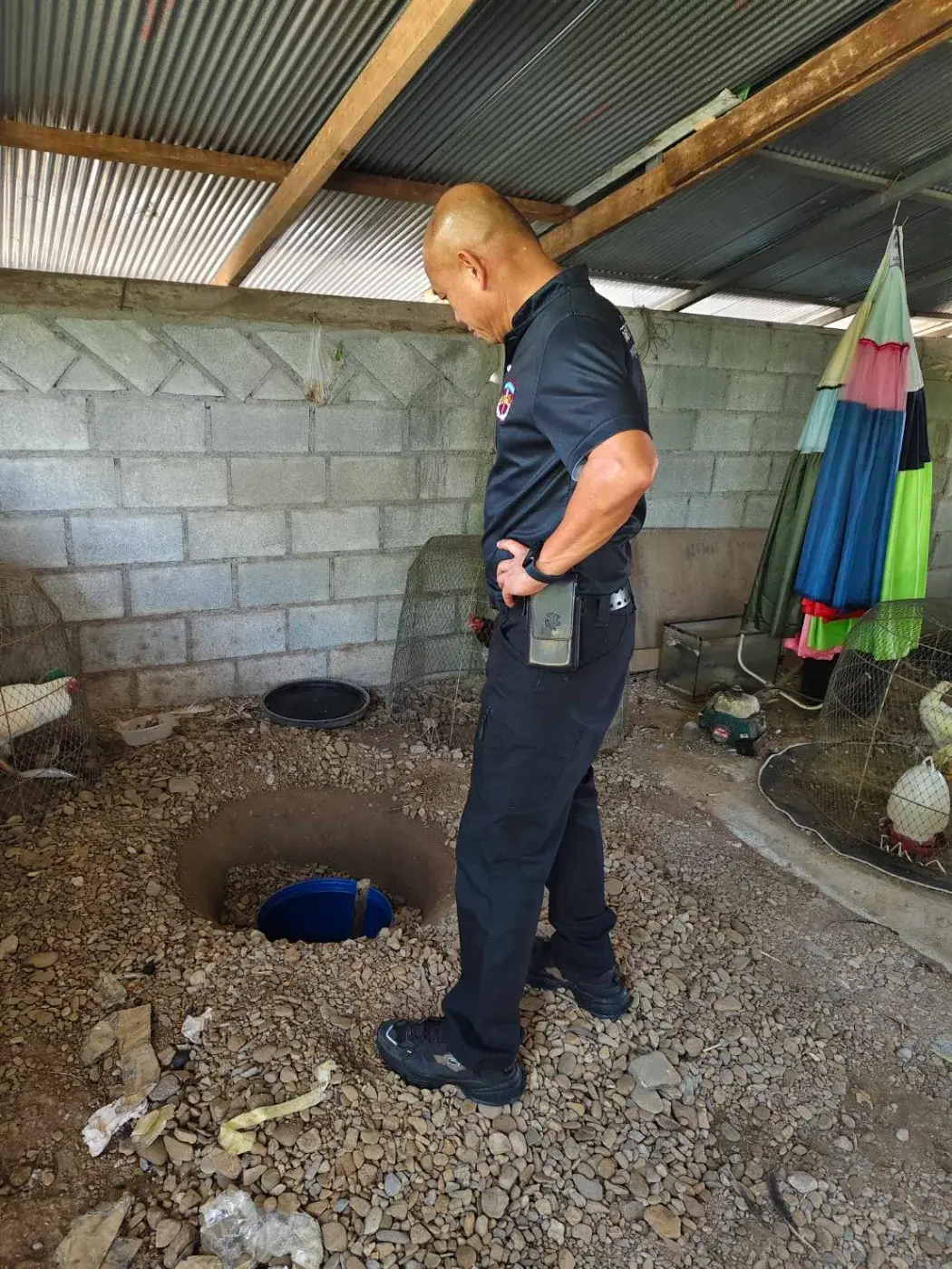 ต่อมาเวลา 01.00 น.วันที่ 11 พ.ย.68 ตำรวจคุมตัวนายยศพร หรือ ” หลง นาเหรง ” สอบขยายผลเข้าตรวจค้นที่บ้านหมู่ 3 ต.นาเหรง อ.นบพิตำ จ.นครศรีธรรมราช ของผู้ต้องหา อย่างไรก็ตามตำรวจตรวจค้นอยู่นานแต่ไม่พบ ประกอบกับผู้ต้องหา มีท่าทีพิรุธ ตำรวจเชื่อว่าน่าจะมียาเสพติดซุกซ่อนอีกจำนวนมาก แต่จากการตรวจค้นในบ้าน ไม่พบยาเสพติดเพิ่ม ระหว่างนั้นตำรวจชุดจับกุม สังเกตเห็นความผิดปกติบริเวณคอกไก่หลังบ้าน ซึ่งไม่เหมือนคอกไก่ทั่วไป โดยบนพื้นคอกไก่ มีก้อนหินหลายชนิด หลายขนาด ที่ใช้สำหรับตกแต่งสวนหย่อม ใส่ตู้ปลา นำมาถมพื้นอย่างน่าสงสัย โดยเฉพาะบนพื้นซุ่มไก่ มีความผิดปกติ จึงสอบเค้นผู้ต้องหา สุดท้ายรับสารภาพว่า ขุดหลุมลึกนำยาเสพติดฝังดินแล้วเอาก้อนหินโรยทับ ก่อนจะเอาซุกไก่และไก่เลี้ยงวางทับบนหลุมที่ฝังยาเสพติด เพื่อให้กลิ่นขี้ไก่กลบกลิ่นยาเสพติด หวังตบตาเจ้าหน้าที่ แต่สุดท้ายไม่รอด เจ้าหน้าที่ชุดจับกุมมีไหวพริบ