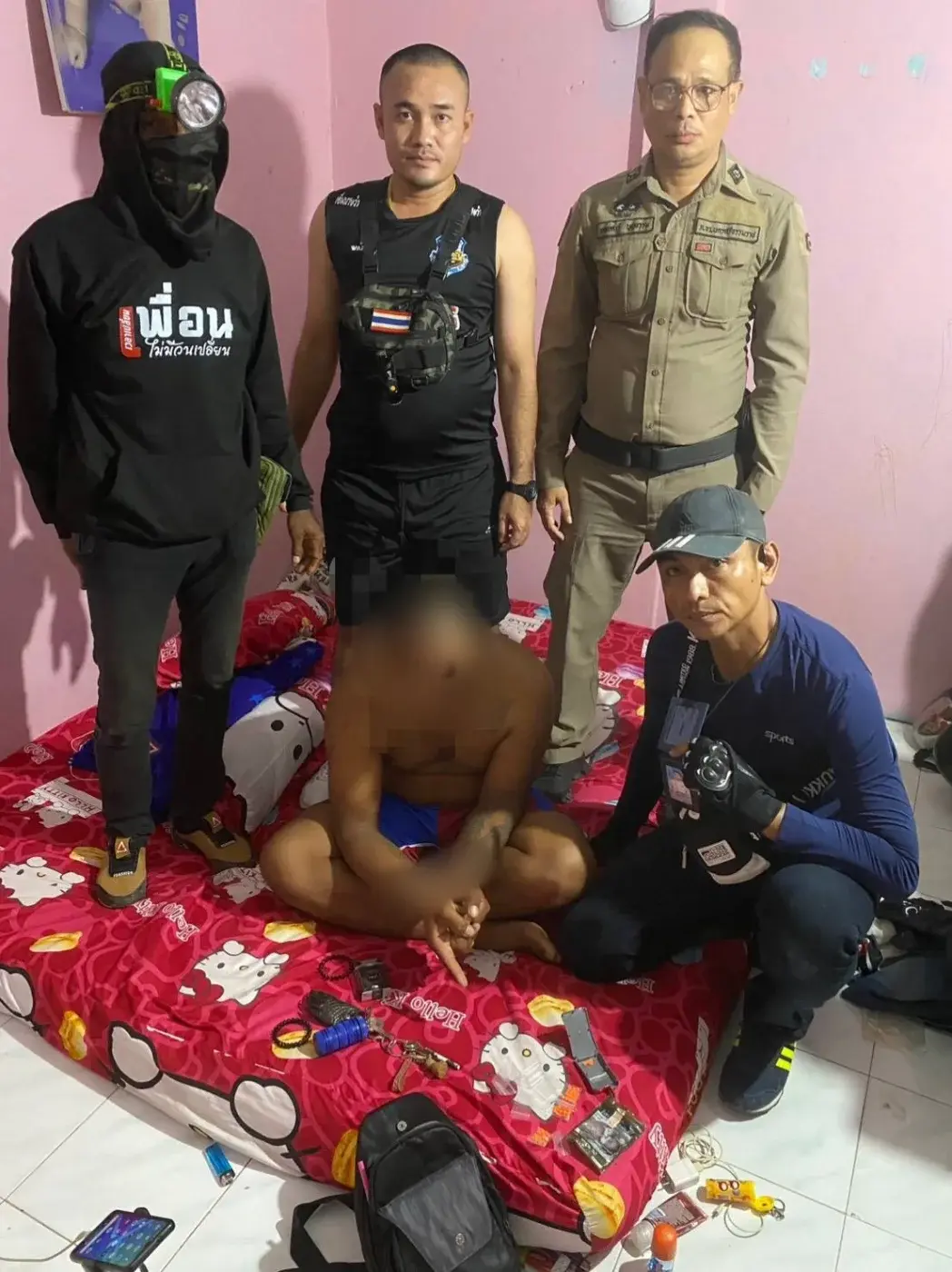 ขี่รถจักรยานยนต์พร้อมกับนายธนาวุฒิ อายุ 29 ปี และนายเอกชัย อายุ 27 ปี เมื่อเห็นเจ้าหน้าที่ นายวุฒิชัย หรือ บังกาด ไหวตัวทัน พยายามขี่รถจักรยานยนต์หลบหนี ระหว่างนั้นรถเกิดเสียหลัก นายวุฒิชัย หรือ บังกาด จึงทิ้งรถวิ่งหนีไปในความมืด ส่วนนายธนาวุฒิ และนายเอกชัย เจ้าหน้าที่จับกุมตัวเอาไว้ได้