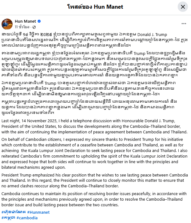 วันนี้ [ตามเวลาท้องถิ่น] นายกรัฐมนตรี "ฮุน มาเนต" ผู้นำของกัมพูชา ได้โพสต์ผ่านเฟซบุ๊กว่า "ผมได้โทรศัพท์พูดคุยกับ ประธานาธิบดี "โดนัลด์ ทรัมป์" ผู้นำของอเมริกา เพื่อหารือเกี่ยวกับสถานการณ์ชายแดนกัมพูชาและไทย โดยมีจุดประสงค์เพื่อเดินหน้าปฏิบัติตามข้อตกลงสันติภาพ ระหว่างทั้ง 2 ประเทศอย่างต่อเนื่อง"