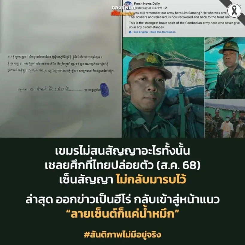 เมื่อวันที่ 16 พ.ย.68 ที่ผ่านมา ทางเพจดัง "กองทัพบกทันกระแส" ได้โพสต์ภาพทหารกัมพูชาที่ถูกทหารไทยจับไปเป็นเชลย นั่นคือ "นายลิม ซัมเอ็ง" หลังส่งตัวกลับไปยังกัมพูชาเมื่อเดือน สค.ที่ผ่านมา เนื่องจากมีอาการบาดเจ็บ ล่าสุดนายทหารคนดังกล่าวก็กลับเข้ามายังกองทัพกัมพูชาอีกครั้ง แถมงานนี้สื่อเขมรยังประโคมข่าวใหญ่ให้เป็นวีรบุรุษเลยทีเดียว