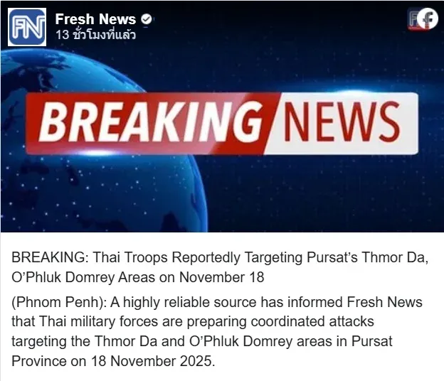 หลังสื่อดังของกัมพูชาอย่าง "เฟรชนิวส์" ได้ขึ้นหน้าจอ BREAKING NEWS โดยอ้างแหล่งข่าวแห่งหนึ่งที่พวกเขาบอกว่ามีความน่าเชื่อถือสูง ได้แจ้งกับทางเฟรชนิวส์ ว่าตอนนี้ทหารไทยกำลังเตรียมการที่จะโจมตีพื้นที่ทมอดาและ O’Phluk Domrey ในพื้นที่จังหวัดโพธิสัตว์ ของกัมพูชา ในวันอังคาร (18พ.ย.) นี้ แต่อย่างไรก็ดีสื่อแห่งนี้ก็ยังไม่ได้ให้รายละเอียดใดๆ เพิ่มเติมแม้แต่น้อย