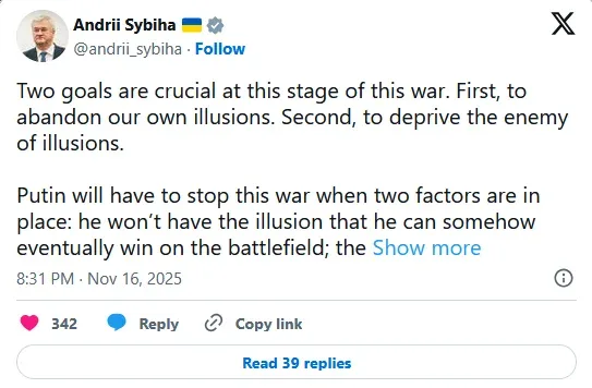 🇺🇦 "อันดรีย์ ซิบีฮา" ยังระบุว่า "ประธานาธิบดี "วลาดิเมียร์ ปูติน" ผู้นำของรัสเซียจะยอมยุติสงคราม ได้ก็ต่อเมื่อเขาหมดอำนาจจอมปลอม ที่เขาคิดว่าสามารถเอาชนะเราบนสนามรบได้" และ "นานาชาติรวมกันมีศักยภาพเพียงพอที่จะบีบให้รัสเซียยุติสงคราม สิ่งที่เราต้องการคือการเปลี่ยนจากคำว่า "ตราบเท่าที่จำเป็น" ไปเป็น "ให้แข็งแกร่งที่สุดเท่าที่จะทำได้""