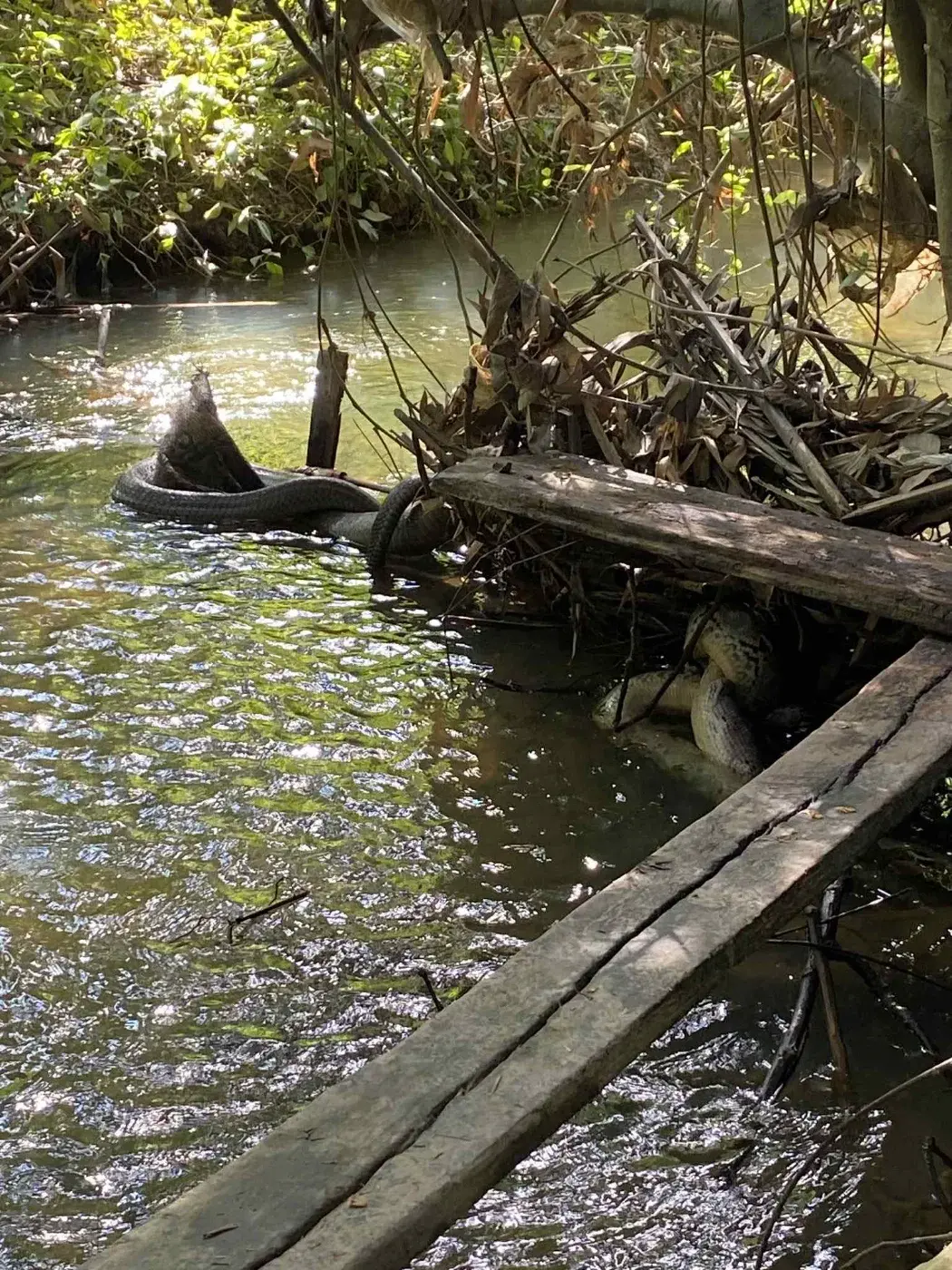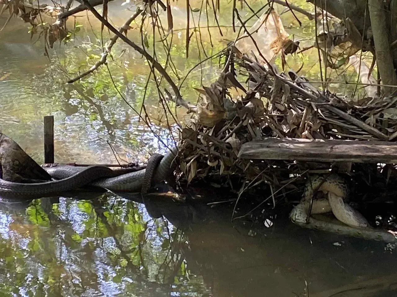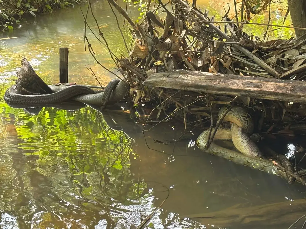 หาดูยาก! งูเหลือมปะทะจงอางยักษ์ริมลำคลอง สุดท้ายงูเหลือมสิ้นท่า
