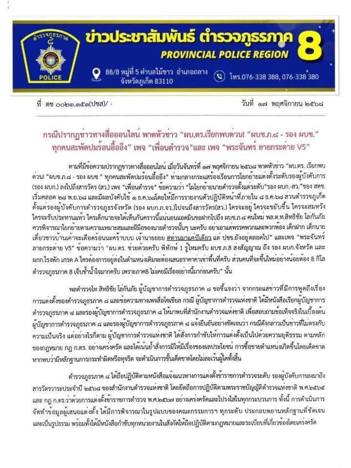 ผู้บัญชาการตำรวจภูธรภาค 8 และรองผู้บัญชาการตำรวจภูธรภาค 8 แจ้งยืนยันอย่างชัดเจนว่า กรณีดังกล่าวเป็นข่าวที่ไม่ตรงกับความเป็นจริง แต่อย่างไรก็ตาม ผู้บัญชาการตำรวจแห่งชาติ ได้สั่งการกำชับให้การแต่งตั้งเป็นไปด้วยความยุติธรรม ตามหลักของกฎหมาย กฎ ก.ตร. อย่างเคร่งครัด และได้เน้นย้ำสั่งการมิให้มีเรื่องของผลประโยชน์ การซื้อขายตำแหน่งเกิดขึ้นโดยเด็ดขาด หากพบว่ามีหลักฐานการกระทำผิดหรือทุจริต จะดำเนินการขั้นเด็ดขาดโดยไม่ละเว้นผู้ใดทั้งสิ้น