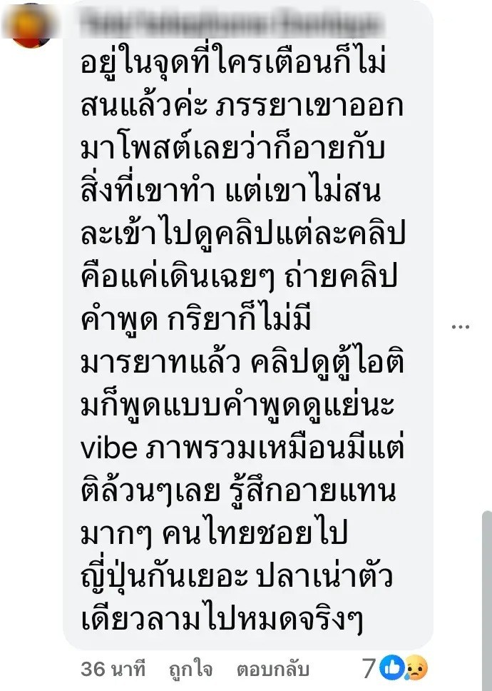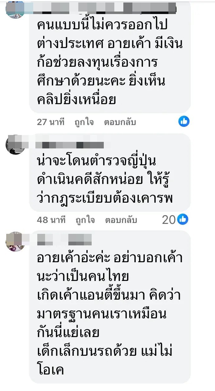อย่างไรก็ตามมีคอมเม้นต์บางคอมเม้นต์ได้บอกว่า เวลาไปเที่ยวต่างประเทศเราไม่ได้ไปแค่เราคนเดียว หรือครอบครัวเดียว - กลุ่มเดียว แต่ยังแบกหน้าตาประเทศไปด้วย