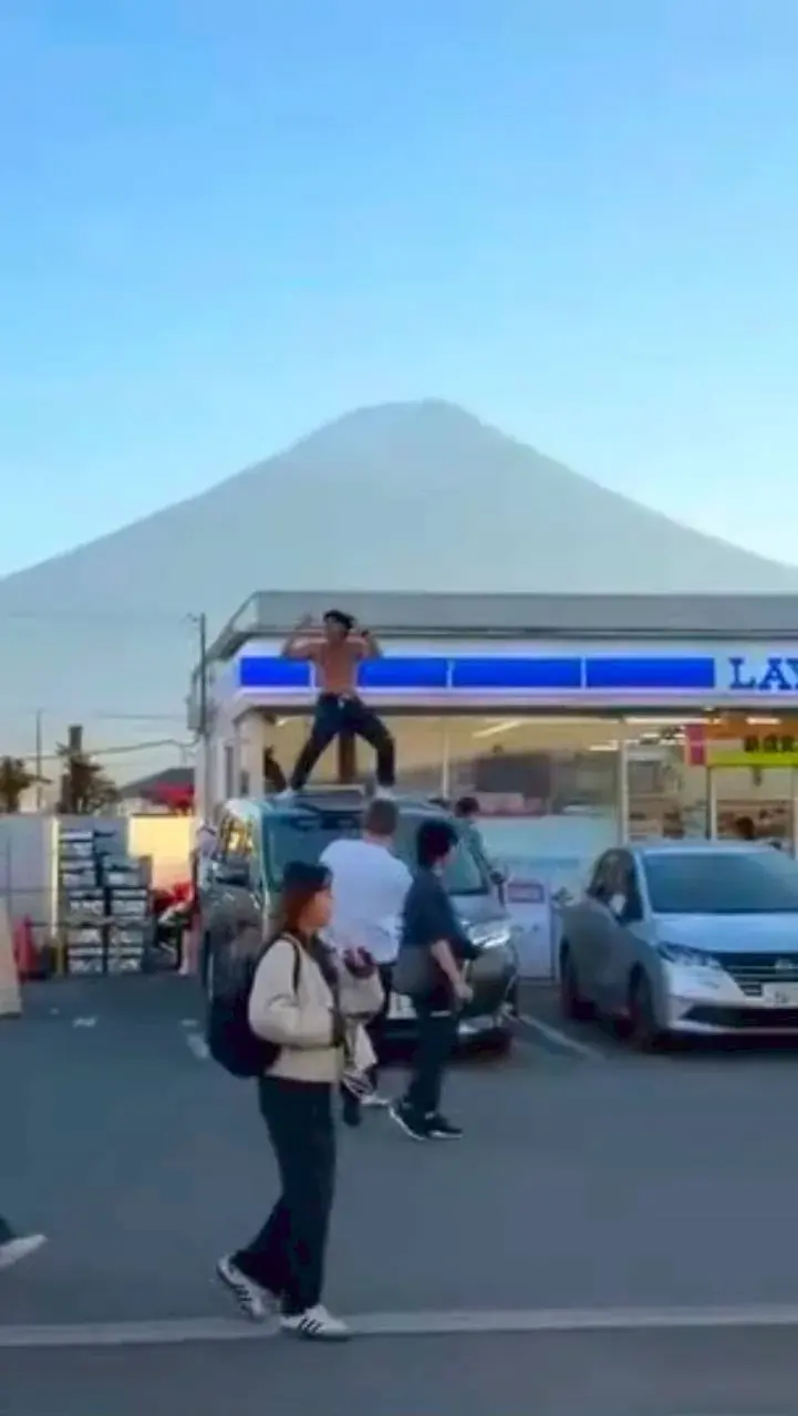 แจ็กแปปโฮ เผยสาเหตุที่ไม่ลบคลิปคอนเทนต์ ปีนขึ้นไปบนหลังคารถ เต้นอยู่หน้าร้านสะดวกซื้อ (ลอว์สัน) ซึ่งมีฉากหลังเป็น ภูเขาไฟฟูจิ