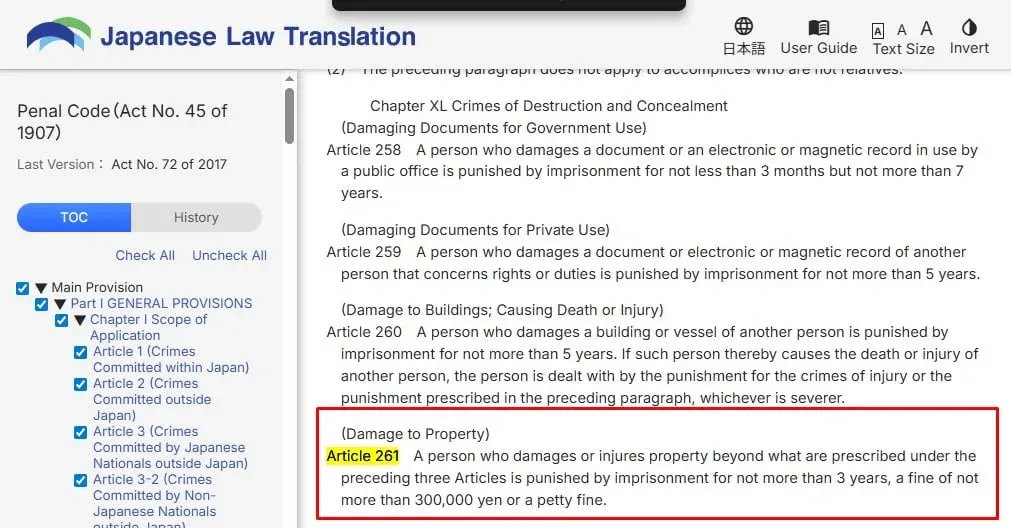 1. ความผิดฐานทำให้ทรัพย์สินเสียหาย หากปีนขึ้นไปบนหลังคารถที่ไม่ใช่ของตัวเองและทำให้เกิดความเสียหาย เจ้าของรถสามารถแจ้งความได้ทันที โทษคือจำคุกไม่เกิน 3 ปี หรือปรับไม่เกิน 300,000 เยน