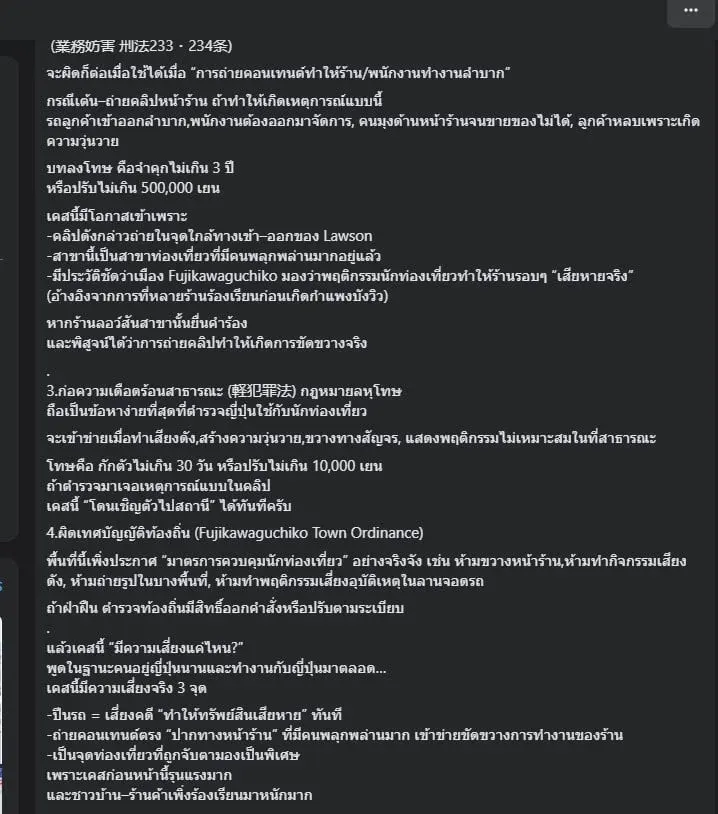 เพจ JapanSalaryman ชี้ว่าการปีนหลังคารถเต้นหน้าร้าน Lawson วิวฟูจิ เข้าข่าย “ทำให้ทรัพย์สินเสียหาย” ซึ่งอาจทำให้ถูกจำคุก 3 ปี หลังเทศบาลสร้างกำแพงบังวิวเพื่อจัดการนักท่องเที่ยวที่มีพฤติกรรมไม่เหมาะสม