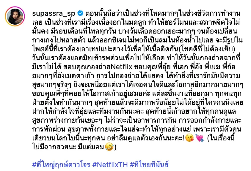 ส่งกำลังใจให้ “เก้า สุภัสสรา” หลังตรวจพบเนื้องอกในมดลูกจนเป็นลมในห้องน้ำ นางเอกสาวเล่าประสบการณ์ขณะถ่ายซีรีส์ ตี๋ใหญ่ฤกษ์ดาวโจร ว่าช่วงนั้นเป็นช่วงที่โหดมาก เนื่องจากมีรอบเดือนที่ไหลออกมาทุกวัน ทำให้ร่างกายขาดออกซิเจน และในที่สุดก็เป็นลมล้มลงในห้องน้ำจนได้รับบาดเจ็บที่คาง ต้องใช้เทปแปะไว้ แต่โชคดีไม่ต้องเย็บ