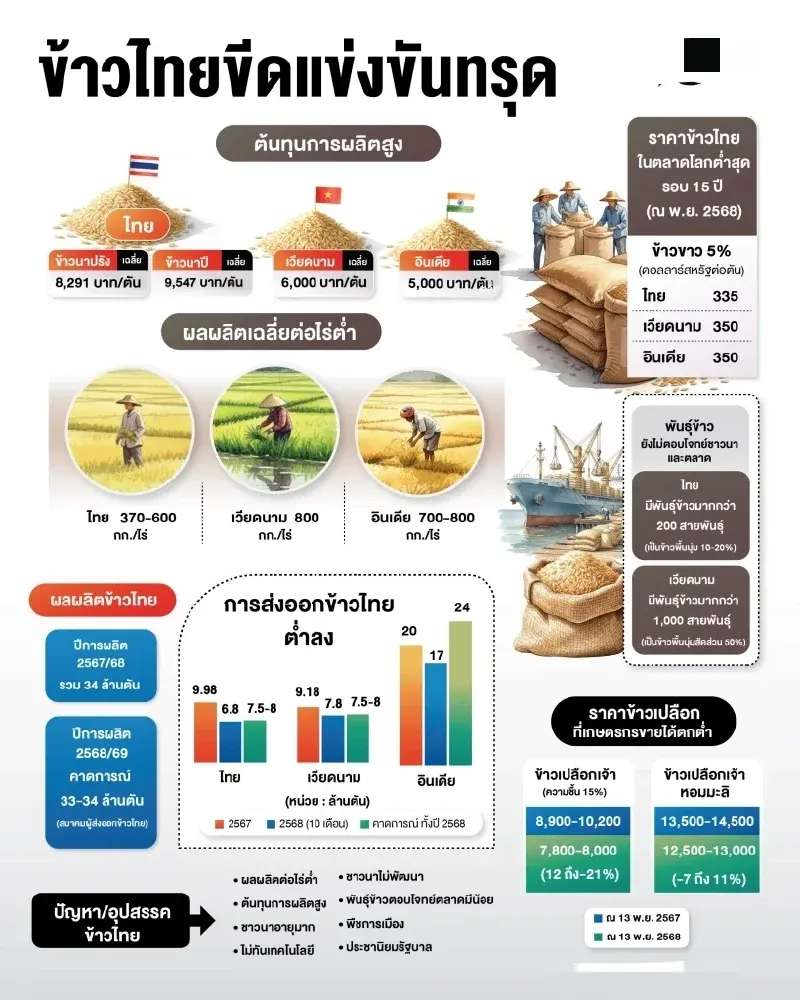 - ไทยขาดการพัฒนาพันธุ์ข้าวใหม่ที่สนองความต้องการตลาดโลก มีเพียง 200 สายพันธุ์ ที่ให้ผลผลิตต่ำ ในขณะที่เวียดนามมีมากกว่า 1,000 สายพันธุ์ ให้ผลผลิตสูงและเป็นที่ต้องการของตลาดโลก ทำให้สามารถขายข้าวได้ในราคาสูงกว่า