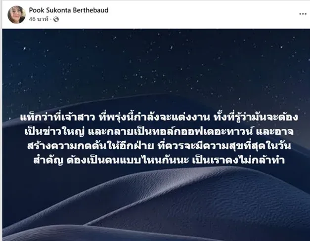 มื่อวันที่ 18 พ.ย.68 ที่ผ่านมา ทางอินฟลูฯ คนดังอย่าง "สรปุก" หรือ "คุณปุ๊ก อินฟลูเอนเซอร์" ก็ได้โพสต์ข้อความผ่านทางเฟซบุ๊คส่วนตัว Pook Sukonta Berthebaud เพื่อแสดงความคิดเห็นต่อเหตุการณ์ดังกล่าว และได้ตั้งคำถามด้วยว่าทำไมถึงเลือกโพสต์แท็กหาว่าที่เจ้าสาวก่อนวันสำคัญ พร้อมกับมองว่าการกระทำแบบนี้อาจสร้างแรงกดดันโดยใช่เหตุ โดยในโพสต์ดังกล่าว สรปุก บอกว่า “แท็กว่าที่เจ้าสาว ที่พรุ่งนี้กำลังจะแต่งงาน ทั้งที่รู้ว่ามันจะต้องเป็นข่าวใหญ่ และกลายเป็นทอล์กออฟเดอะทาวน์ และอาจสร้างความกดดันให้อีกฝ่าย ที่ควรจะมีความสุขที่สุดในวันสำคัญ ต้องเป็นคนแบบไหนกันนะ เป็นเราคงไม่กล้าทำ”