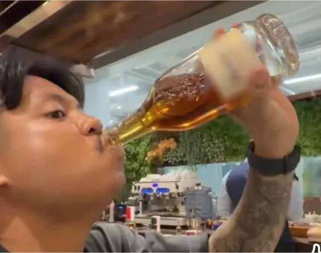 พฤติกรรมสุดยี๋ แทนที่จะรินใส่แก้ว กลับใช้ปาก กระดกขวดแบบเอาปากอมปากขวดเลย จนกระทั่งเหล้าหมดขวด