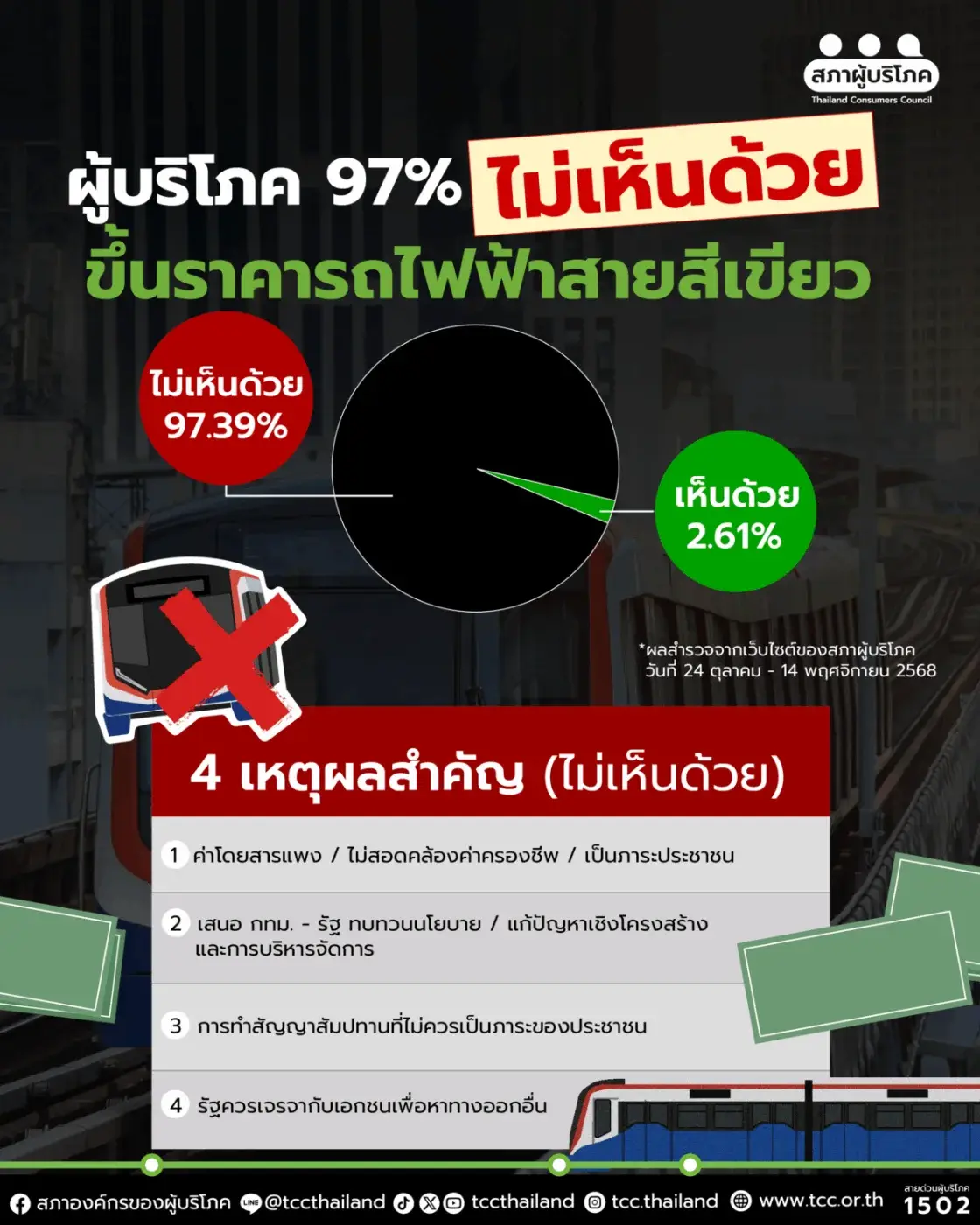 หลังจากที่กทม.ไฟเขียวให้รถไฟฟ้าสายสีเขียวส่วนต่อขยาย ขึ้นราคาค่าโดยสารตั้งแต่วันที่ 1 พย.68 ผลสำรวจ ชี้ว่าผู้บริโภค 97% ไม่เห็นด้วย สะท้อนปัญหา “ภาระค่าครองชีพ” ที่หนักเกินไป เพราะการเดินทางไม่ได้มีแค่ค่าบีทีเอสเพียงอย่างเดียว ต้องต่อรถเข้าบ้านบ้าง หรือต่อรถไปที่ทำงานอีก บางส่วนมองว่าราคาค่าใช้จ่ายใกล้เคียงกับการเดินทางด้วยรถส่วนตัว