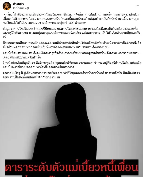 “ดาราตัวแม่ชวนเพื่อนลงทุน แล้วผิดนัดชำระเป็นเงินจำนวนมากกว่า 400 ล้านบาท”
