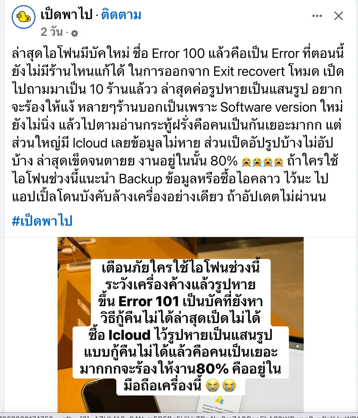 เตือนภัยไอโฟน บั๊ก Error 100 ทำเครื่องค้างในโหมดกู้คืน ผู้ใช้บางรายข้อมูลภาพถ่ายเกือบแสนรูปหายเกลี้ยง เหตุไม่ได้แบ็กอัป ร้านซ่อมชี้อาจเป็นปัญหาจาก iOS ไม่เสถียร แนะทางเดียวคือล้างเครื่อง ด้านผู้เชี่ยวชาญย้ำ! ควรสำรองข้อมูลไว้บน iCloud อย่างสม่ำเสมอ