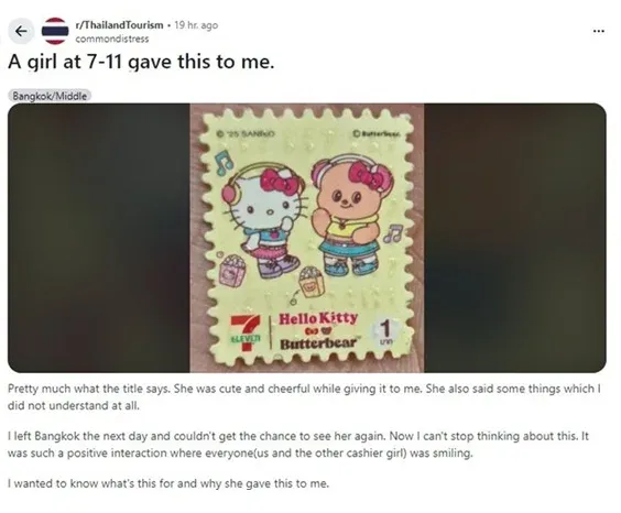 ทั้งนี้ทางหนุ่มคนดังกล่าว ก็ได้โพสต์ข้อความว่า "มีหญิงสาวคนหนึ่งที่อยู่ร้าน 7-11 ให้แสตมป์ผมมา 1 ดวง เธอดูน่ารักและร่าเริงมาก และตอนที่ให้แสตมป์ดวงนี้กับผม ตอนนั้นเธอก็ได้พูดอะไรบางอย่างด้วย ซึ่งผมเองไม่เข้าใจเลย โดยในวันถัดมาผมได้ออกจากกรุงเทพฯ และไม่มีโอกาสได้พบกับเธออีกเลย ตอนนี้ผมหยุดคิดถึงเรื่องนี้ไม่ได้เลยจริงๆ มันช่างเป็นความรู้สึกดีๆ ที่เรายิ้มให้กัน ผมอยากรู้ว่าแสตมป์ดวงนี้มันคืออะไร และทำไมเธอถึงให้สิ่งนี้กับผม"