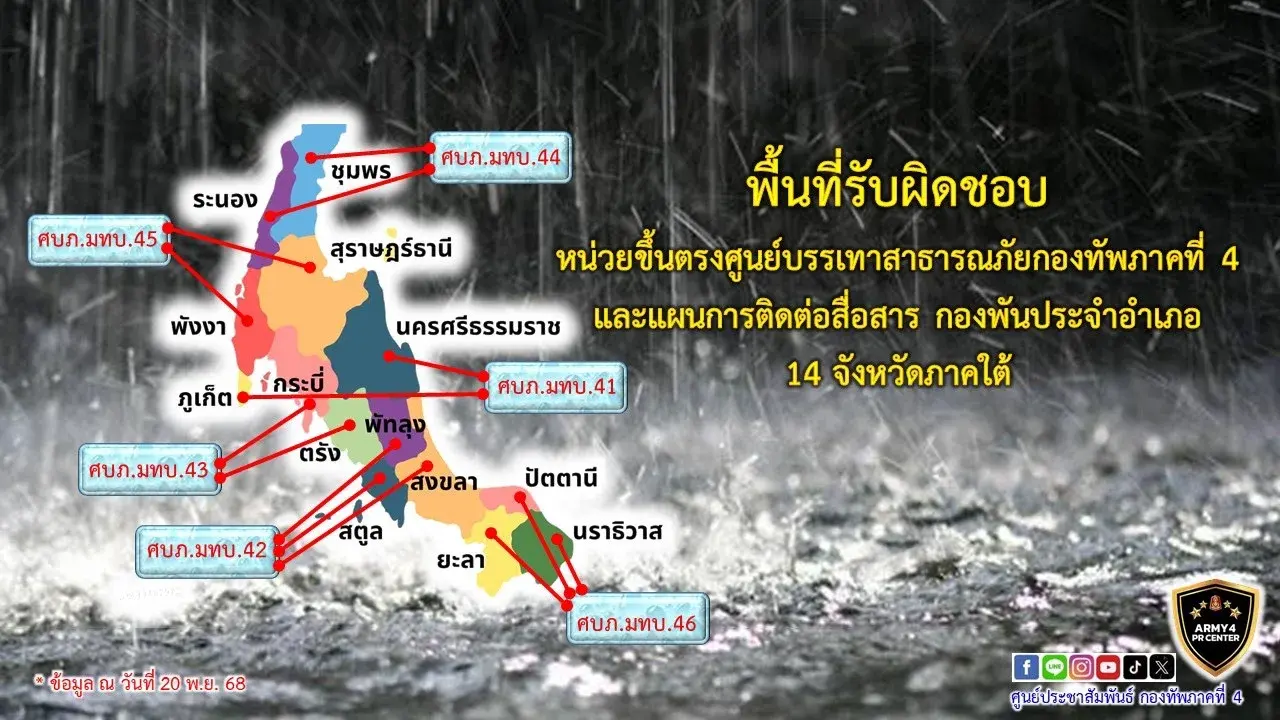 ตามที่เกิดสถานการณ์ฝนตกหนักถึงหนักมากบริเวณภาคใต้ ตั้งแต่ 18 พฤศจิกายน 2568และยังคงมีฝนตกหนักต่อเนื่อง โดยเฉพาะในพื้นที่ ชุมพร สุราษฎร์ธานี นครศรีธรรมราช พัทลุง สตูล ตรัง และสงขลา นั้น ล่าสุด วันที่ 21 พฤศจิกายน 2568 ร้อยโท ยุทธชัย ชูถิ่น ผู้ช่วยโฆษกกองทัพภาคที่ 4 ชี้แจงว่า พลโท นรธิป โพยนอก แม่ทัพภาคที่ 4/ผู้อำนวยการศูนย์บรรเทาสาธารณภัยกองทัพภาค 4 มีความห่วงใยพี่น้องประชาชนที่ได้รับผลกระทบ โดยขอเน้นย้ำและแจ้งเตือนพี่น้องประชาชนเตรียมรับมือกับสถานการณ์ฝนตกหนักและอาจเกิดน้ำท่วมฉับพลันในพื้นที่เสี่ยง การตรวจสอบความแข็งแรงของอาคารบ้านเรือน การขนย้ายสิ่งของและสัตว์เลี้ยงไปในที่ปลอดภัย หลีกเลี่ยงการเดินทางผ่านทางน้ำไหล – ลำคลอง – จุดที่มีน้ำท่วมขัง และหลีกเลี่ยงพื้นที่ ลาดเชิงเขา หลีกเลี่ยงการใช้ไฟฟ้า เครื่องใช้ไฟฟ้าเมื่อพื้นเปียก พร้อมทั้งสั่งการให้หน่วยทหารทุกหน่วยเตรียมพร้อมกำลังพลและยุทโธกรณ์ในการช่วยเหลือประชาชน ตลอด 24 ชั่วโมง และลงพื้นที่โดยไม่ต้องรอสั่งการ บูรณาการกับทุกภาคส่วน เพื่อให้มั่นใจว่าหน่วยงานภาครัฐพร้อมที่จะเป็นกำลังหลักในการให้ความช่วยเหลือประชาชนได้อย่างรวดเร็วและเต็มกำลังความสามารถเมื่อเกิดสถานการณ์ฉุกเฉิน
