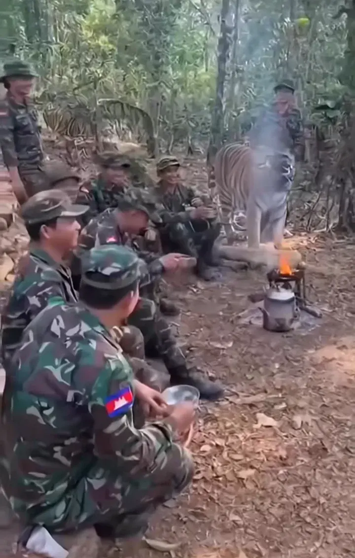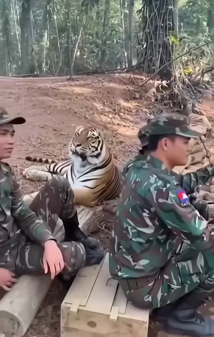 เนื้อหาในคลิป ทหารเขมรลงคลิป AI หลอกคนเขมรด้วยกันระบุว่า แม้แต่เสือยังเป็นมิตรกับทหารผู้กล้าในแนวหน้า ซึ่งในภาพจะเห็นทหารกลุ่มหนึ่งนั่งอยู่และมีภาพเสือขนาดใหญ่ปรากฏอยู่ใกล้ ๆ