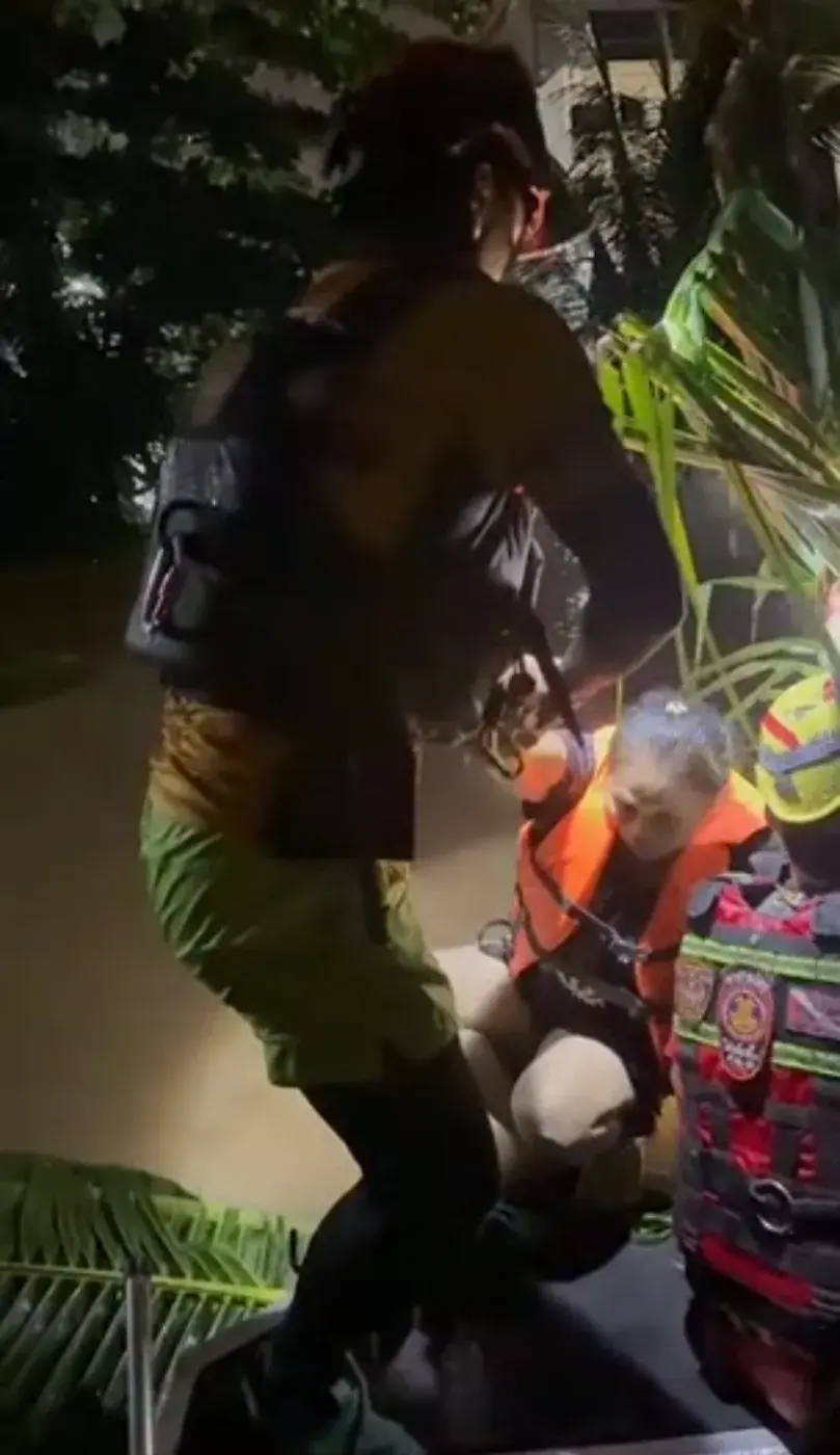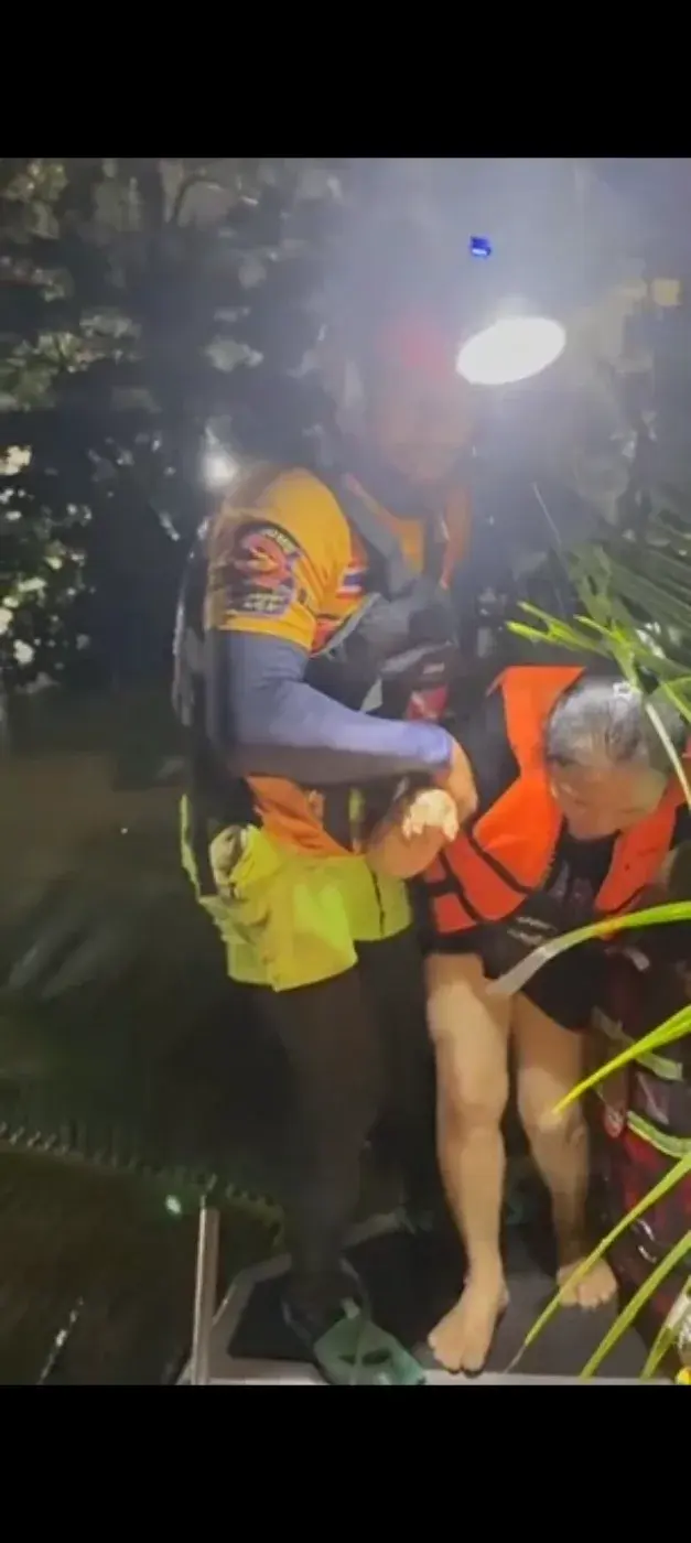 กู้ภัยเมืองคอน ลุยน้ำท่วมช่วยหญิงวัย 62 หนีน้ำท่วมติดต้นมะพร้าวนาน 6 ชม