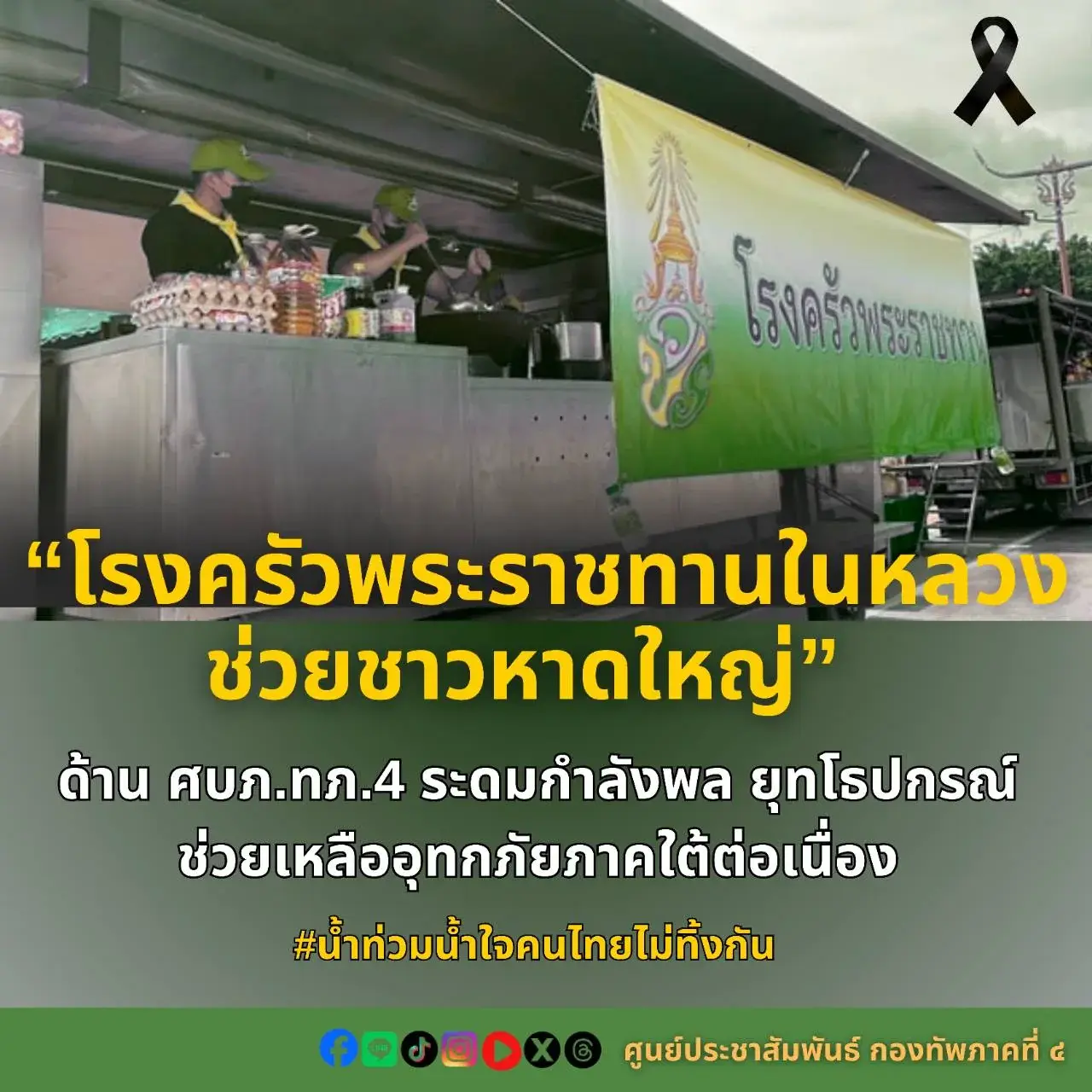 ในหลวงพระราชทาน “โรงครัวพระราชทาน” ช่วยชาวหาดใหญ่ ด้าน ศบภ.ทภ.4 ระดมกำลังพลช่วยเหลืออุทกภัยภาคใต้ต่อเนื่อง