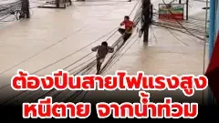 เผยนาทีชีวิตหนุ่มปีนสายไฟข้ามตึกหนีตๅย หลังน้ำทะลักสูง บ้านจมมิดถึงชั้น 2