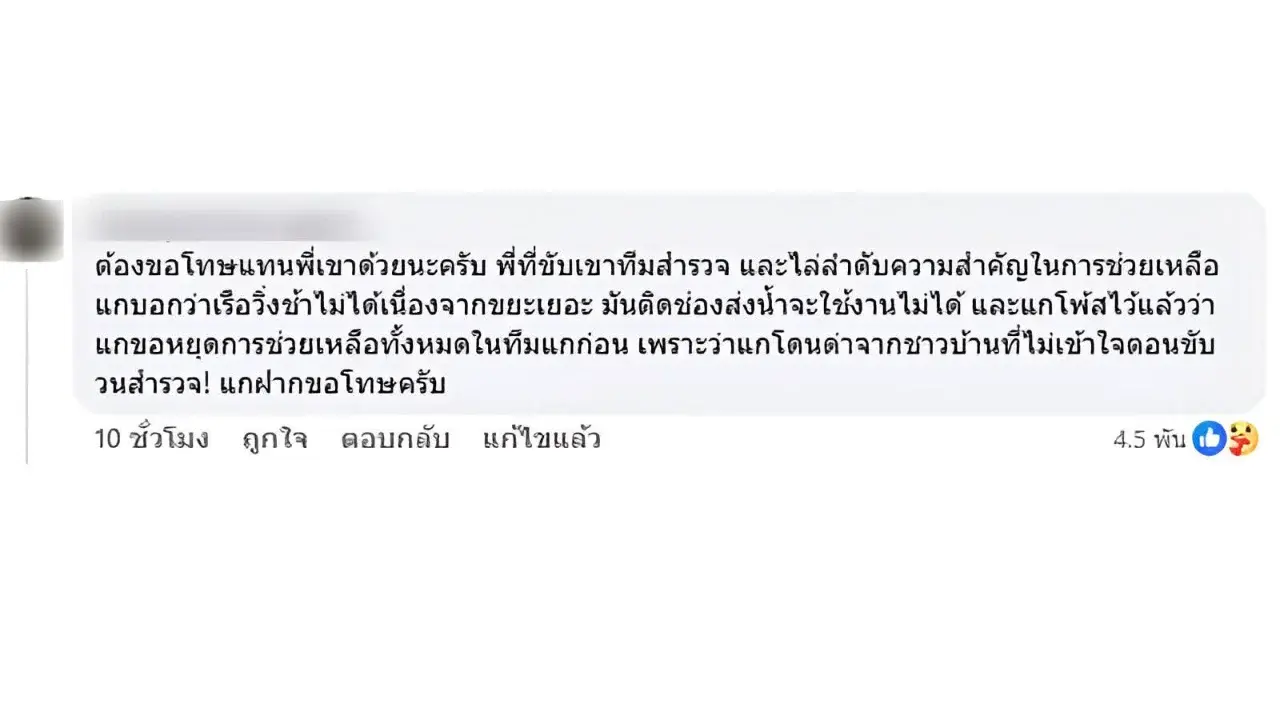 จากกรณีนี้เองก็ได้มีคอมเมนต์ที่เข้ามาชี้แจงแทนกู้ภัยโดยมีการระบุว่าสาเหตุเป็นการขับด้วยความเร็วคือ "ทีมสำรวจ" และสาเหตุที่ต้องวิ่งเร็วเพราะ: "เรือวิ่งช้าไม่ได้เนื่องจากขยะเยอะ มันติดช่องส่งน้ำจะใช้งานไม่ได้" สุดท้ายทีมกู้ภัยต้อง "ขอหยุดการช่วยเหลือทั้งหมดในทีมแกก่อน" เพราะทนไม่ไหวที่โดนชาวบ้านที่ไม่เข้าใจ "ด่า" กลางวิกฤต น้ำท่วม