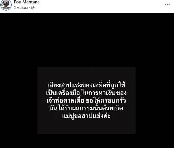 ขณะเดียวกันตัวของดาราศาสตร์ก็ได้เป็นการออกมาเคลื่อนไหวผ่าน Facebook โดยมีการระบุข้อความมาไว้ดังนี้ "เสียงสาปแช่งของเหยื่อที่ถูกใช้เป็นเครื่องมือในการหาเงินของเจ้าพ่อศาลเตี้ย ขอให้ครอบครัว มันได้รับผลกรรมนั้นด้วยเถิด แม่ปูขอสาปแช่ง" พร้อมโพสต์ที่ว่า "ปูเคารพคำพิพากษาศาลชั้นต้น และขอใช้สิทธิยื่นอุทธรณ์ค่ะ"