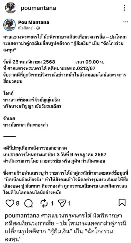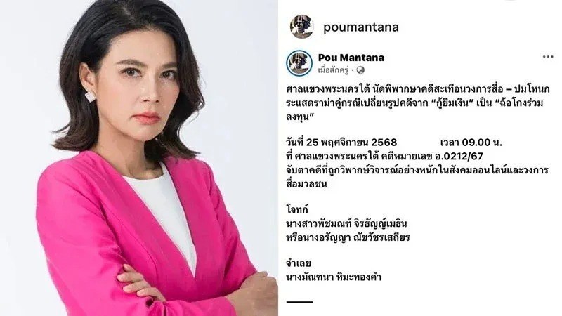 สำหรับวันนี้มาติดตามคดีความคืบหน้าของ ดารานักแสดงชื่อบางอย่าง "ปู มัณฑนา" ซึ่งล่าสุดนี้ได้มีการรายงานว่าศาลแขวงพระนครใต้ มีคำพิพากษาจำคุกเป็นเวลา 2 ปี โดยไม่รอลงอาญา ซึ่งเป็นคดีฉ้อโกง และหลอกให้ลงทุน