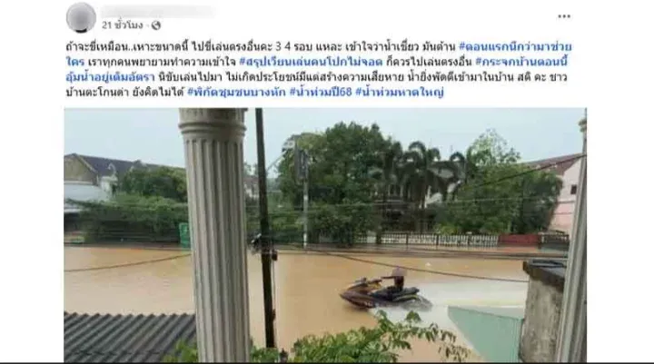 ผู้ใช้เฟซบุ๊กรายหนึ่งในพื้นที่ ชุมชนบางหัก ได้โพสต์ภาพเจ้าหน้าที่อาสาที่ขับเจ็ตสกี พร้อมระบุข้อความตำหนิอย่างรุนแรง