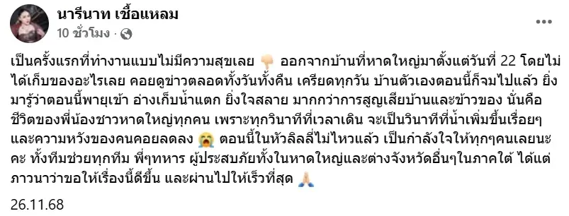 นักร้องลูกทุ่งสาว ลิลลี่เครียดหนักตอนนี้บ้านที่หาดใหญ่น้ำท่วมหนักและสูงมาก