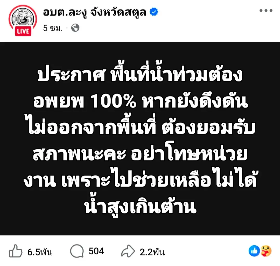 อบต.ละงู ประกาศ พื้นที่น้ำท่วมต้องอพยพ 100% หากประชาชน ไม่ยอมออกจากพื้นที่ต้องยอมรับสภาพ อย่าโทษหน่วยงานไม่เตือน เพราะไปช่วยเหลือไม่ได้น้ำสูงเกินที่จะเข้าพื้นที่