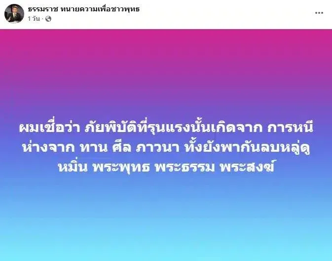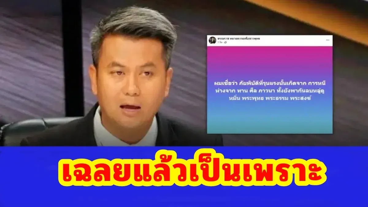 ทว่าท่ามกลางวิกฤตที่ประชาชนกำลังดิ้นรนเอาชีวิตรอด ทนายความชื่อดังบนโลกออนไลน์ “ทนายธรรมราช สาระปัญญา” เจ้าของเพจ “ธรรมราช ทนายความเพื่อชาวพุทธ” ได้ออกมาโพสต์ข้อความที่กลายเป็นดราม่าอย่างหนัก โดยระบุว่า “ภัยพิบัติรุนแรงเกิดจากการที่ผู้คนห่างไกลทาน–ศีล–ภาวนา และพากันลบหลู่พระพุทธ พระธรรม พระสงฆ์”