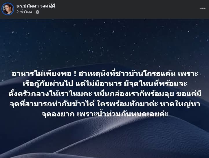 สืบเนื่องมาจากกรณีที่น้ำท่วมขังจังหวัดสงขลาโดยเฉพาะพื้นที่หาดใหญ่ได้รับผลกระทบอย่างมากประชาชนได้รับความเดือดร้อนน้ำท่วมขังสูงประชาชนไม่สามารถอพยพออกจากพื้นที่ได้ทำให้ภาครัฐและภาคเอกชนรวมไปถึงหน่วยกู้ภัยต้องเร่งให้การช่วยเหลือล่าสุดดร.ปนัดดา วงศ์ผู้ดี ออกมาโพสต์ข้อความผ่าน Facebook โดยระบุเอาไว้ดังนี้
