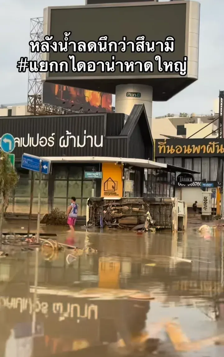 มีภาพรถยนต์ รถบรรทุกคันหนึ่ง พลิกคว่ำนอนตะแคง อยู่ในสภาพที่เสียหายอย่างหนักกลางซากโคลน สะท้อนถึงแรงน้ำที่รุนแรงในช่วงวิกฤตที่ผ่านมา