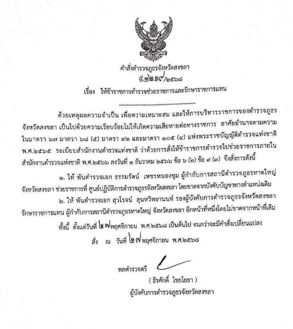 เด้งผู้กำกับหาดใหญ่ไป ช่วยราชการ ตำรวจภูธรสงขลาให้ เหตุผล เพื่อความเหมาะสมไม่ให้เกิดความเสียหายต่อราชการ