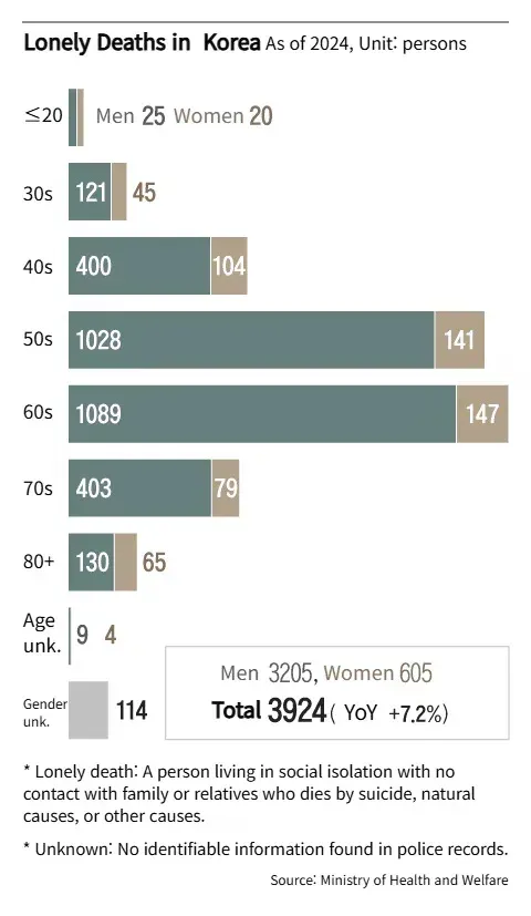 โดยวันนี้ [ตามเวลาท้องถิ่น] กระทรวงสาธารณสุขและสวัสดิการ ของเกาหลีใต้ ได้ประกาศผลการสำรวจ "สถานการณ์การเสียชีวิตจากความโดดเดี่ยว ปี 2024" ซึ่งสะท้อนผลลัพธ์ดังกล่าว โดยการสำรวจครั้งนี้วิเคราะห์จากคดีที่เกี่ยวข้อง กับงานสอบสวนของสำนักงานตำรวจแห่งชาติ จากจำนวน 57,145 คดีในปีที่ผ่านมา เพื่อจำแนกกรณีที่เข้าเกณฑ์การเสียชีวิต จากความโดดเดี่ยวและวิเคราะห์ลักษณะเฉพาะ ของผู้เสียชีวิต โดยยอดผู้เสียชีวิตจากความโดดเดี่ยว ในปีที่ผ่านมาอยู่ที่ 3,924 ราย เพิ่มขึ้น 7.2% จาก 3,661 รายในปีก่อนหน้า จำนวนผู้เสียชีวิตจากความโดดเดี่ยวต่อประชากร 100,000 คนเพิ่มจาก 7.2 เป็น 7.7 ในช่วงเวลาเดียวกัน ขณะที่จำนวนผู้เสียชีวิตจากความโดดเดี่ยว ต่อการเสียชีวิตทั้งหมด 100 รายเพิ่มจาก 1.04 เป็น 1.09 ซึ่งทั้ง 2 ตัวเลข ล้วนเป็นสถิติสูงสุดตั้งแต่เริ่มการสำรวจในปี 2017